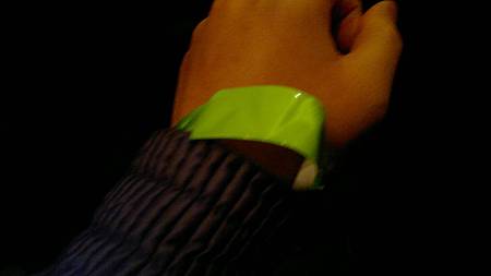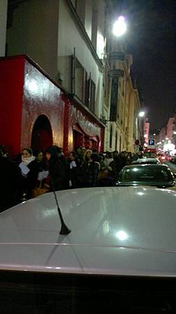 我知道當晚肯定人會很多,但場地畢竟只是個小酒館,我沒想到隊伍可以排的那麼長...看不到盡頭,看得我臉都綠了,而且門口大字貼著"憑票入場"的法文,要混進去,我實在沒把握...。我從隊伍頭走到隊伍尾,隊伍中的人全盯著我瞧,不知道在看三小朋友。唯一符合我期望的是全是大陸人,於是我抓緊我的護照,走到門口,看著一位華人臉孔的翻譯員說:先生...我可以用現金入場嗎...? 先生:呃...抱歉沒辦法... 我:我...我台灣來的...但我進不去><(低頭十分失望貌),他轉身持疑了一會兒,悄然拉開柵欄:來!快進! 當下爽度到達第九重天,說了一句多謝後就從裡衝。結果瞬間被攔下來....幹他媽的...裡面居然還有第二道門...他們要我出示邀請函,幸好翻譯先生馬上過來拎著我到接待台前,說這位是受邀者,櫃台小姐笑咪咪地拿出一張A4上面寫滿各大電視、唱片公司的清單:先生請問您是哪個單位的呢?翻譯先生說:喔!他是我的客人! 於是我就得到綠色的VIP手環同時也感動地心懷感恩。